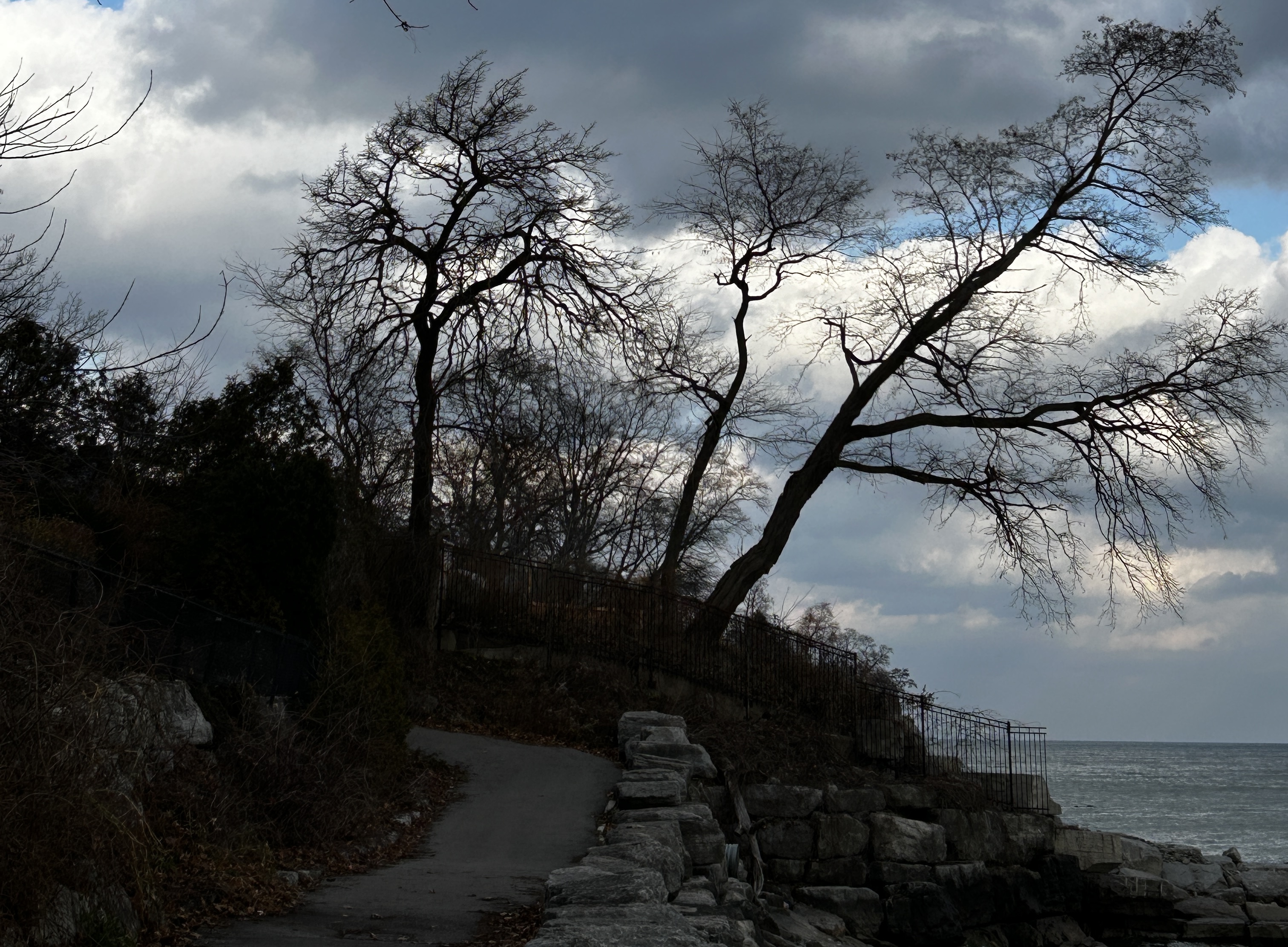 The fat full moon thrusts its hard light into my room striping my bed in fertile mourning darkness. Against the greying sky, waving branches warn the cold is here and coming, in winter’s inevitable embrace.